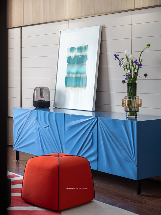 层次分明的蓝像一根线,串联起居者日常里有关美、有关格调、有关体验的故事,如珍珠般在岁月的流淌中耀眼夺目。在光影游戏中,静下心来你会发现那些贝壳纹理的柜体、抽象简洁的挂画以及如花朵盛放的地毯,就是一种充满艺术与韵律的组合,在不同的时分去观看,都有笑意和温暖从眼中跑出来。