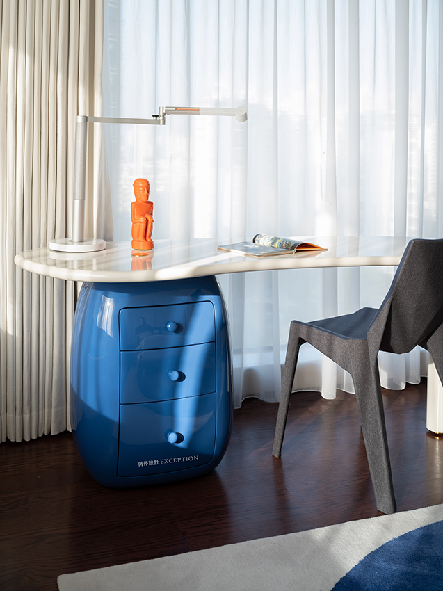 推开门,清风和阳光悄悄溜进来,不同层次的蓝色在光影中融合、交叠,有大海的深邃,亦或是天空的晴朗,编织成一派自然随性的清爽。建筑体块构成的宝蓝色造型书桌,以合适的角度容纳双人办公、小孩互动的场景。看世界的角度对了, 哪里都是风景。