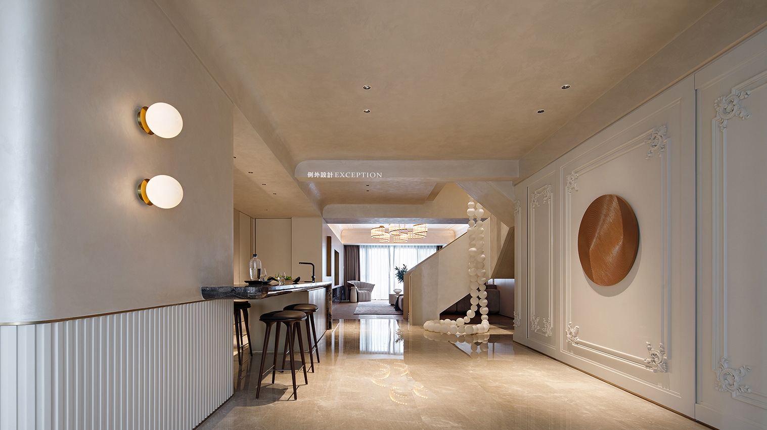 随着视线的上移,白色串珠装饰如同珍珠项链指引着新的空间视角,承启上下空间的优雅叙事。