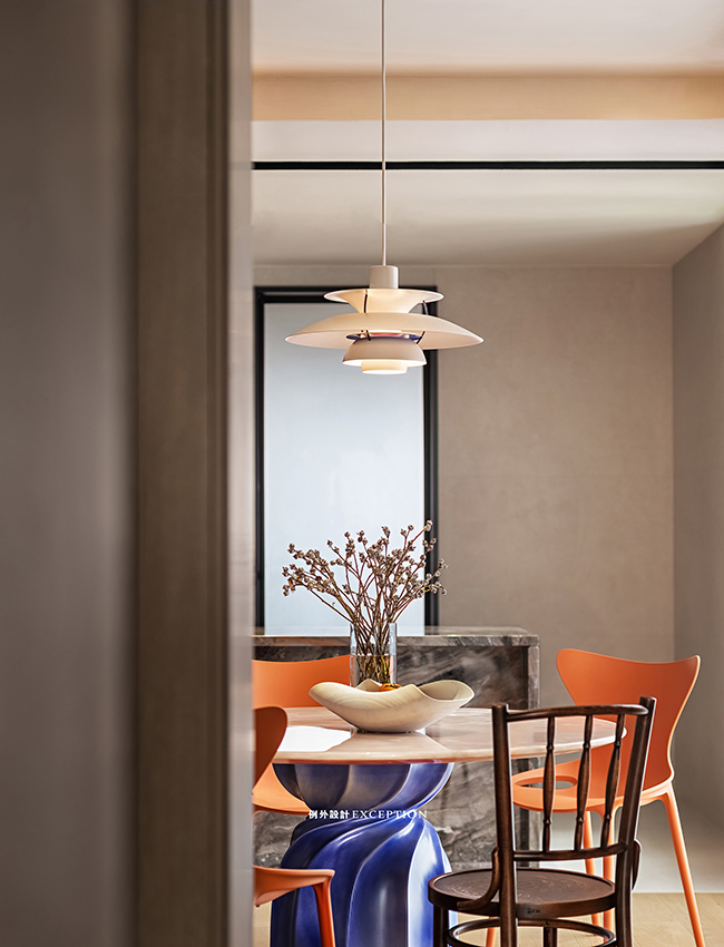 有人说仪式感就是使某一天与其他日子不同,使某一时刻,与其他时刻不同。餐厅的仪式感很大程度源于餐桌。屋主精选的粉玉大理石桌面与设计师定制的实木底座过分契合,宛若天成。可以想象一家人每天来到餐厅吃饭或者做烘焙,在高颜值的餐桌前该有多么地享受。