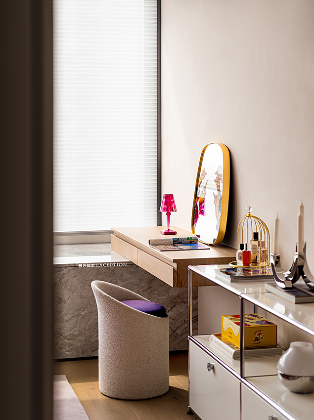 临窗搭设梳妆台,经典的几何构成为空间带来一份简单却实用的美。usm经典书柜在角落也难掩光芒,不仅负责美貌,还兼顾了收纳展示的任务。鸿艺源设计始终观照人的尺度,在日常生活与艺术审美中保持恰到好处的平衡。