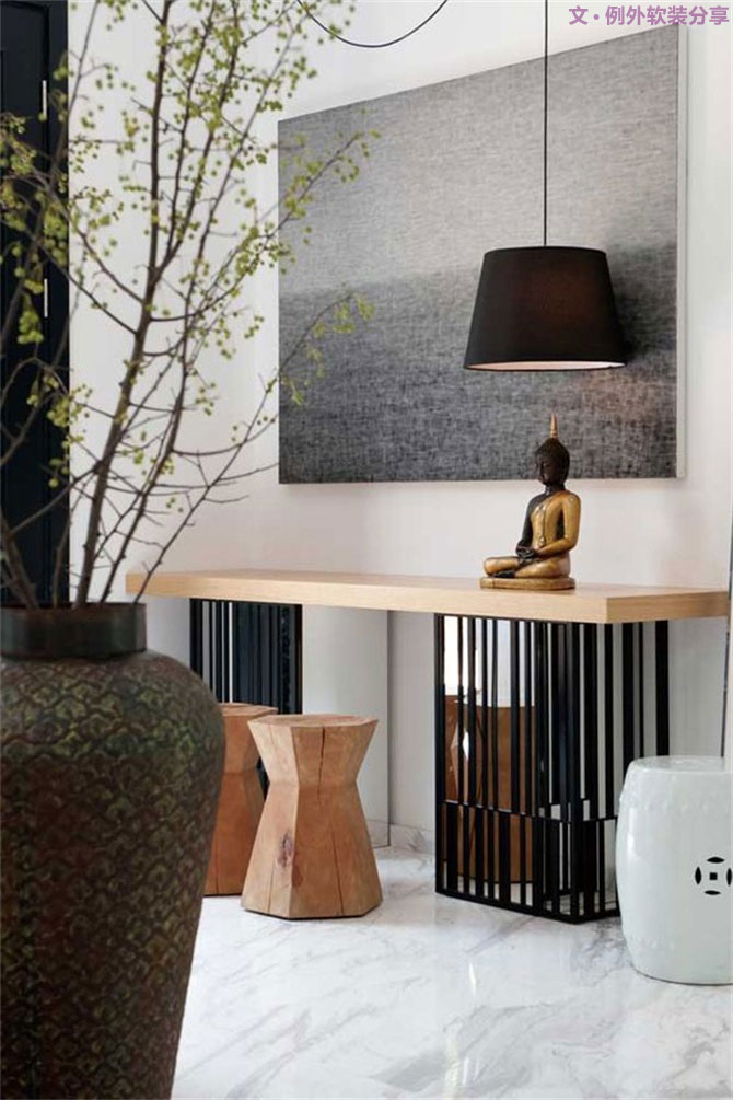 與傳統水墨藝術所不同的是,通常表現手法舍棄或減弱色彩,講究留白,提煉線條筆墨,甚至藝術呈現將傳統藝術與自我融入到自然和生活中去,并把自然與生活看作是一種境界,體現“天人合一”的人文精神。其作為空間陳設中的平面表現形式,在虛與實的對比中,達至一種空靈的意境,并且通過水墨變化的層次,表達內心的向往與悠遠,在居家氛圍中營造了深遠的空間關系。