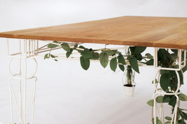 桌腳的栽種盆培上土,就可以種下漂亮的植物,而整個桌子除了英國橡木制的桌面之外,統統是由框架形成的,通透了視野。種上的爬藤植物順著框架逐漸蜿蜒整個桌子,房間里將是滿眼的綠意蔓延。當然你也可以嘗試種植番茄土豆薄荷等小型蔬果,屆時就可以直接在桌腳摘下,桌上享用啦!
