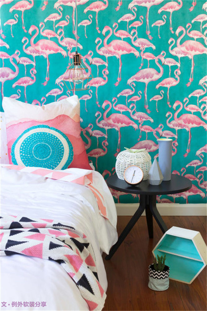尤其是這幅鋪滿火烈鳥墻紙的臥室,床品也完全依照畫面上的兩種色彩來進行搭配,藍色清新,粉紅耀目,簡單卻富有深意,一個小清新風格的家就這樣出現了。而這間客廳的大幅山水寫意畫,與簡約的家私相搭,竟凝練出有緣深邃的意境。