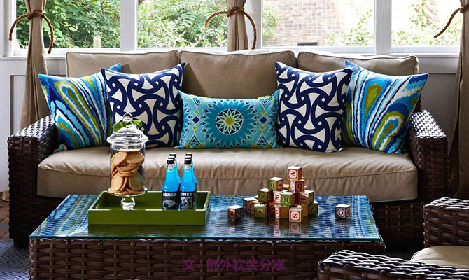 客廳設計以藍白兩色為色彩主線,別致的大理石茶幾搭配金色沙發和海軍藍花紋靠墊,呈現出清新的希臘風,金屬擺飾凸顯高貴時尚感。陽光房里,以藤藝家具搭配藍綠色靠枕,與窗外景致遙相呼應,休閑愜意,這里無疑是全家人休閑聊天的好地方。