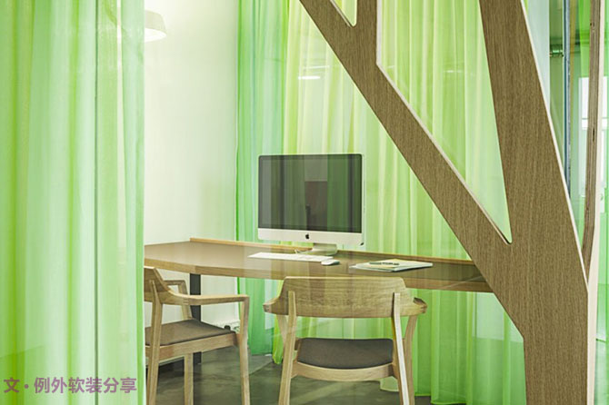 而瑞士蘇黎世這家MMP公司請專門的設計師進行規劃,打造了這樣一個以綠色為主題的辦公空間軟裝設計。整個空間只有兩種顏色:綠色和原木色--完全就是將清新自然的森林場景活化出來。玻璃隔板分割出一個個獨立的辦公區域,在適當的距離安置切割成樹形的木板以模仿林立的樹木,玻璃板內側掛滿綠色的落地簾幔,綠意盎然充滿自然的氣息,半透明的簾幔顯得輕盈而浪漫,讓人的視覺頓時放松。同時辦公桌椅也全部運用原木打造,簡約的現代造型讓空間不失商務氣息。