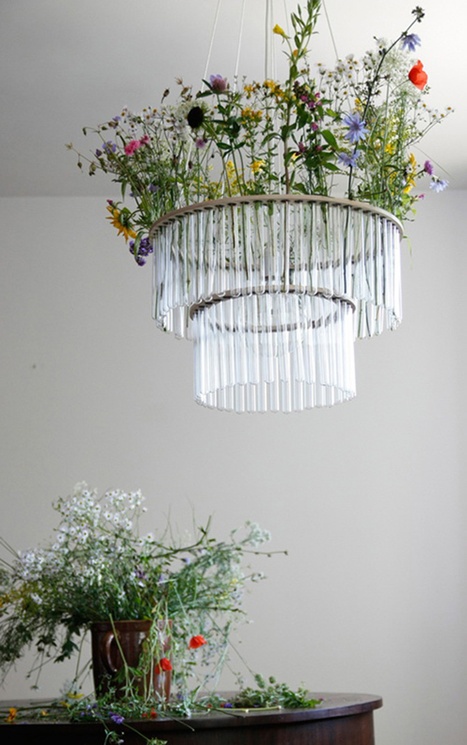 這款吊燈構造簡單,只需準備吊線、擱架、一定數量的玻璃試管即可,擱架可以單層、也可以設置成更有層次感的雙層。當試管是空的時候,就如同晶瑩透亮的冰柱,簡單大方的造型適合原木色系或者充滿北歐風情的空間;你也可以在試管里灌入彩色顏料調制的水,當燈光點亮時,透過彩色的液體折射出奇異的光芒,尤其適合放在現代感十足的空間。而當你在試管里插上鮮花,它就成為了一個架空的花架,給空間平添些許自然的氣息,這樣獨特的吊燈只有田園風格的空間能HOLD住啦。