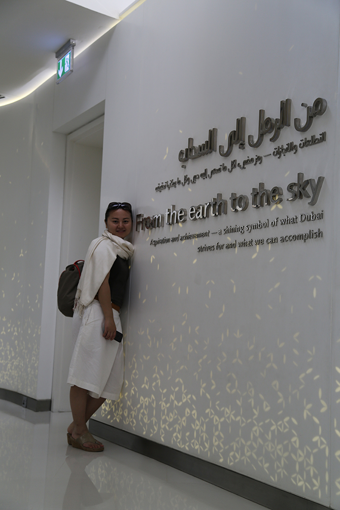 《碟中諜4》的場景還歷歷在目,眼看到哈利法塔的時候,便在各個地方尋早阿湯哥的足跡。這就是造價達15億美元、828米高的世界高樓與人工構造物。其實它的建築結構是很單一的,由多個管狀的塔組成的。這裡有世界上快的電梯,據說速度高可達17.4米/秒,我們還特意計時,從1樓到123樓觀景台,大致用了56-57秒,大致一秒鐘2層多,感覺還沒反應過來已經到了目的地,太不敢置信。