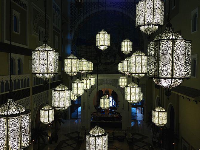 不容錯過的便是精美絕倫的八十八盞中世紀阿拉伯特色的大吊燈,隨著大廳長廊延伸到遠方,印著美麗的花紋的璀璨燈光指引著你,漫步時光的長河。