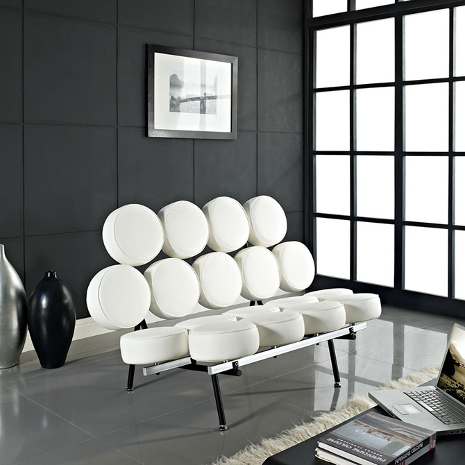 Marshmallow沙发是乔治?尼尔森有名的作品之一,译为棉花糖沙发,我们也叫它鼓椅,因为它的样子看起来就像一个个Tom-Tom鼓的排列组合。1956年,乔治?尼尔森和一个名叫艾文?哈勃(Irving Harper)的年轻设计师,被一个发明出注塑光盘的发明家所启发,认为将这种形态用于沙发设计可以减少生产成本而且更耐用。当时他们将18个这样的注塑光盘安放在一个铁架上,Marshmallow的原型就此诞生。后来Herman Miller家具公司在1999年将它加以改进,产品一经推出便抓住世人的目光,迎合了市场要求摩登时髦又兼顾功能性的造型要求。